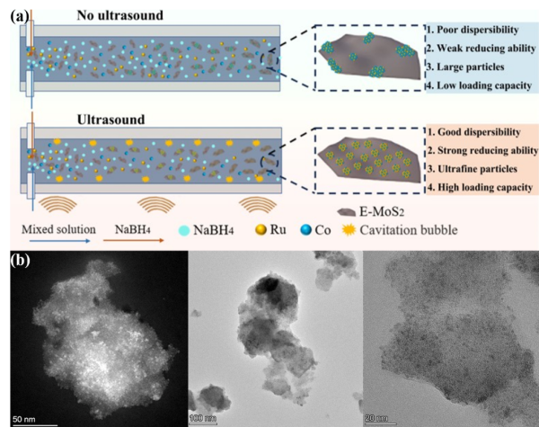 1、(a) USMR合成过程示意图。(b) USMR法制备的RuCo@MoS2催化剂TEM图,显示合金颗粒均匀分散。