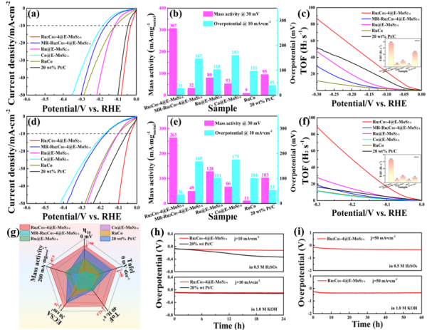 KOH中的质量活性和过电位(在10 mA·cm-2时)。Ru2Co1-4@E-MoS2-x和对照催化剂在(c) 0.5 M H2SO4和(f) 1.0 M KOH中的TOF 图谱和 TOF 值(过电位为150 mV的条件下)。(g) 不同催化剂在 1.0 M KOH 溶液中的η10、ECSA、塔菲尔斜率、TOF和质量活性的比较。(h) Ru2Co1-4@E-MoS2-x、20 wt% Pt/C在0.5 M H2SO4和1.0 M KOH中10 mA·cm-2下的电位时间曲线。(i) Ru2Co1-4@E-MoS2-x、20 wt% Pt/C在0.5 M H2SO4和1.0 M KOH中50 mA·cm-2下的电位时间曲线。