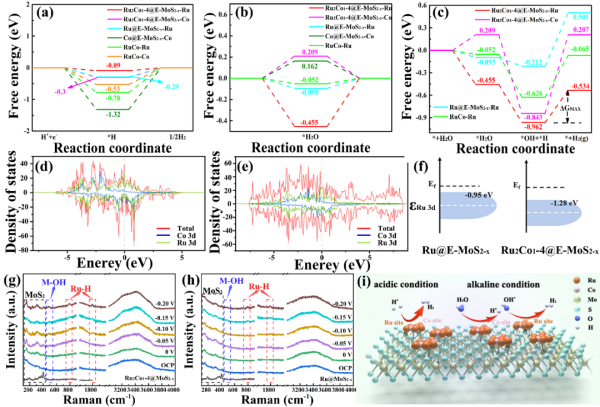 图3、(a)不同样品活性位点的 ΔGH*值。(b) 不同样品活性位点处H2O的吸附能图。(c) 不同样品活性位点处H2O分解和H2生成的能量图。(d)–(e) Ru@E-MoS2-x和Ru2Co1-4@E-MoS2-x的态密度(DOS);(f) 不同样品 Ru 3d 轨道的 d 带中心。(g) Ru2Co1-4@E-MoS2-x和(h) Ru@E-MoS2-x在1 M KOH中HER的原位拉曼光谱;(i) HER机理示意图。
