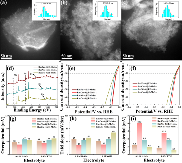 4、透射电子显微镜图像及尺寸分布:(a) Ru2Fe1-4@E-MoS2-x、(b) Ru2Ni1-4@E-MoS2-x以及(c) Ru2Cu1-4@E-MoS2-x。(d) Ru2Fe1-4@E-MoS2-x、Ru2Ni1-4@E-MoS2-x和Ru2Cu1-4@E-MoS2-x的XPS光谱。不同 Ru 基合金负载的 E-MoS2-x在(e) 0.5 M H2SO4和(f) 1.0 M KOH中的LSV曲线。相应的(g) η10值、(h) Tafel斜率和(i) Cdl值,这些值分别对应于不同电解质中负载不同Ru基合金的E-MoS2-x