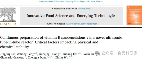 科研进展 | 通过新型超声套管式反应器连续制备维生素 E 纳米乳剂:影响理化稳定性的关键因素