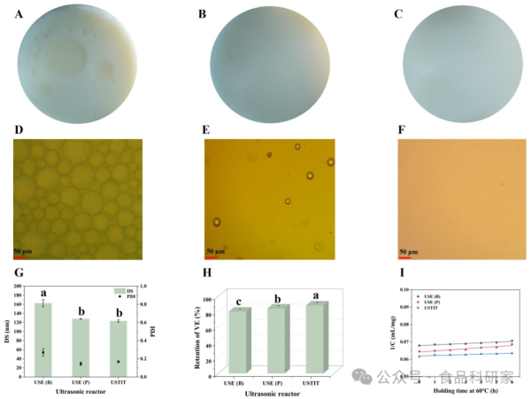 图 8:(A) 超声浴(USE (B))制备的纳米乳剂表面图像;(B) 超声探头(USE (P))制备的纳米乳剂表面图像;(C) 超声管中管反应器(USTIT)制备的纳米乳剂表面图像;(D) 超声浴(USE (B))制备的纳米乳剂光学显微镜图像;(E) 超声探头(USE (P))制备的纳米乳剂光学显微镜图像;(F) 超声管中管反应器(USTIT)制备的纳米乳剂光学显微镜图像;(G) 制备方法对纳米乳剂粒径(DS)和多分散指数(PDI)的影响;(H) 制备方法对纳米乳剂中维生素 E(VE)保留率的影响;(I) 不同纳米乳剂中维生素 E(VE)在 60℃保温期间的降解特性(条件:5.4% 表面活性剂、Span-80/Tween-80(质量比 28/72,亲水亲油平衡值 12)、添加抗坏血酸棕榈酸酯(AP)、水油比(9/1,体积比)、超声频率 20 kHz、超声电功率 45 W、温度 50℃、流速 3 mL/min。不同字母表示差异显著)