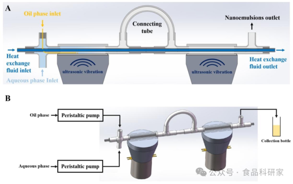 图 1:(A) 超声管中管反应器(USTIT)结构示意图;(B) 超声管中管反应器(USTIT)连续制备纳米乳剂的流程图