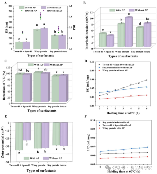 图 2:(A) 表面活性剂对纳米乳剂粒径(DS)和多分散指数(PDI)的影响;(B) 表面活性剂对纳米乳剂界面张力的影响;(C) 表面活性剂对纳米乳剂中维生素 E(VE)保留率的影响;(D) 无抗坏血酸棕榈酸酯(AP)保护时,维生素 E 纳米乳剂在 60℃保温期间的降解特性;(E) 表面活性剂对纳米乳剂 zeta 电位的影响;(F) 有抗坏血酸棕榈酸酯(AP)保护时,维生素 E 纳米乳剂在 60℃保温期间的降解特性(制备条件:5.4% 表面活性剂、Span-80/Tween-80(质量比 28/72,亲水亲油平衡值 12)、乳清蛋白(亲水亲油平衡值 > 10)、大豆分离蛋白(亲水亲油平衡值 > 10)、水油比(9/1,体积比)、超声频率 20 kHz、超声电功率 45 W、温度 50℃、流速 3 mL/min。不同字母表示差异显著)