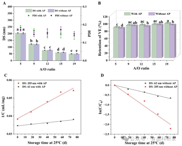图 3:(A) 水油比(A/O)对纳米乳剂粒径(DS)和多分散指数(PDI)的影响;(B) 水油比(A/O)对纳米乳剂中维生素 E(VE)保留率的影响;(C) 无抗坏血酸棕榈酸酯(AP)时,不同粒径的维生素 E 纳米乳剂在 25℃长期储存期间的一级降解动力学;(D) 有抗坏血酸棕榈酸酯(AP)时,不同粒径的维生素 E 纳米乳剂在 25℃长期储存期间的二级降解动力学(制备条件:5.4% 表面活性剂、Span-80/Tween-80(质量比 28/72,亲水亲油平衡值 12)、超声频率 20 kHz、超声电功率 52 W、温度 50℃、流速 3 mL/min;粒径 205 nm 由水油比 5/1 制得,粒径 62 nm 由水油比 15/1 制得。不同字母表示差异显著)