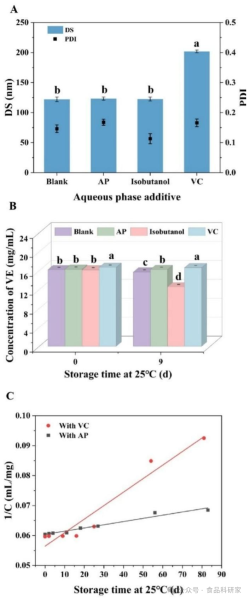 图 4:(A) 水相添加剂对纳米乳剂粒径(DS)和多分散指数(PDI)的影响;(B) 水相添加剂对纳米乳剂中维生素 E(VE)稳定性的影响;(C) 有维生素 C(VC)或抗坏血酸棕榈酸酯(AP)时,维生素 E 纳米乳剂在 25℃长期储存期间的二级降解动力学(制备条件:5.4% 表面活性剂、Span-80/Tween-80(质量比 28/72,亲水亲油平衡值 12)、水油比(9/1,体积比)、超声频率 20 kHz、超声电功率 52 W、温度 50℃、流速 3 mL/min。不同字母表示差异显著)