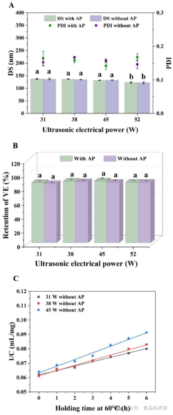 图 5:(A) 超声电功率对超声管中管反应器(USTIT)制备的纳米乳剂粒径(DS)和多分散指数(PDI)的影响;(B) 超声电功率对超声管中管反应器(USTIT)制备的纳米乳剂中维生素 E(VE)保留率的影响;(C) 无抗坏血酸棕榈酸酯(AP)时,维生素 E 纳米乳剂在 60℃保温期间的降解特性(条件:5.4% 表面活性剂、Span-80/Tween-80(质量比 28/72,亲水亲油平衡值 12)、水油比(9/1,体积比)、温度 50℃、流速 3 mL/min。不同字母表示差异显著)