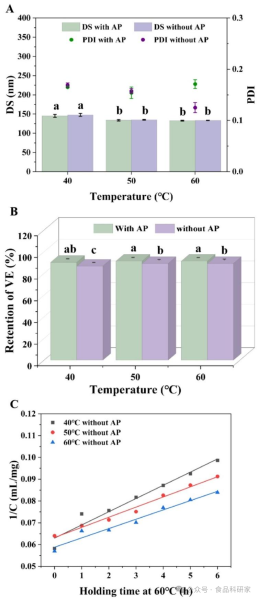 图 6:(A) 温度对超声管中管反应器(USTIT)制备的纳米乳剂粒径(DS)和多分散指数(PDI)的影响;(B) 温度对超声管中管反应器(USTIT)制备的纳米乳剂中维生素 E(VE)保留率的影响;(C) 无抗坏血酸棕榈酸酯(AP)时,维生素 E 纳米乳剂在 60℃保温期间的降解特性(条件:5.4% 表面活性剂、Span-80/Tween-80(质量比 28/72,亲水亲油平衡值 12)、水油比(9/1,体积比)、超声频率 20 kHz、超声电功率 45 W、流速 3 mL/min。不同字母表示差异显著)