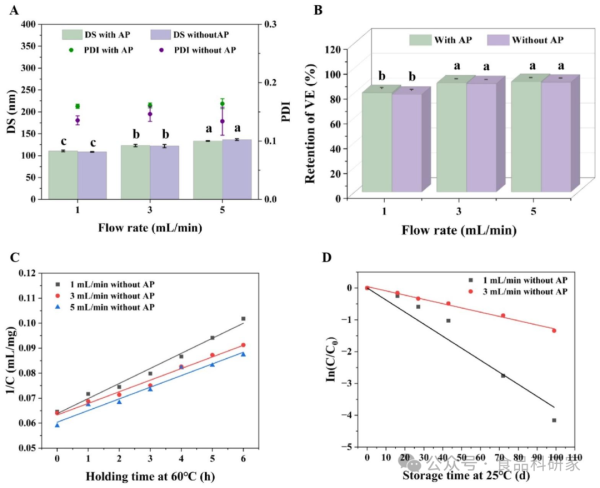 图 7:(A) 流速对超声管中管反应器(USTIT)制备的纳米乳剂粒径(DS)和多分散指数(PDI)的影响;(B) 流速对超声管中管反应器(USTIT)制备的纳米乳剂中维生素 E(VE)保留率的影响;(C) 无抗坏血酸棕榈酸酯(AP)时,维生素 E 纳米乳剂在 60℃保温期间的降解特性;(D) 无抗坏血酸棕榈酸酯(AP)时,不同流速下制备的维生素 E 纳米乳剂在 25℃的长期储存实验(条件:5.4% 表面活性剂、Span-80/Tween-80(质量比 28/72,亲水亲油平衡值 12)、水油比(9/1,体积比)、超声频率 20 kHz、超声电功率 52 W、温度 50℃。不同字母表示差异显著)